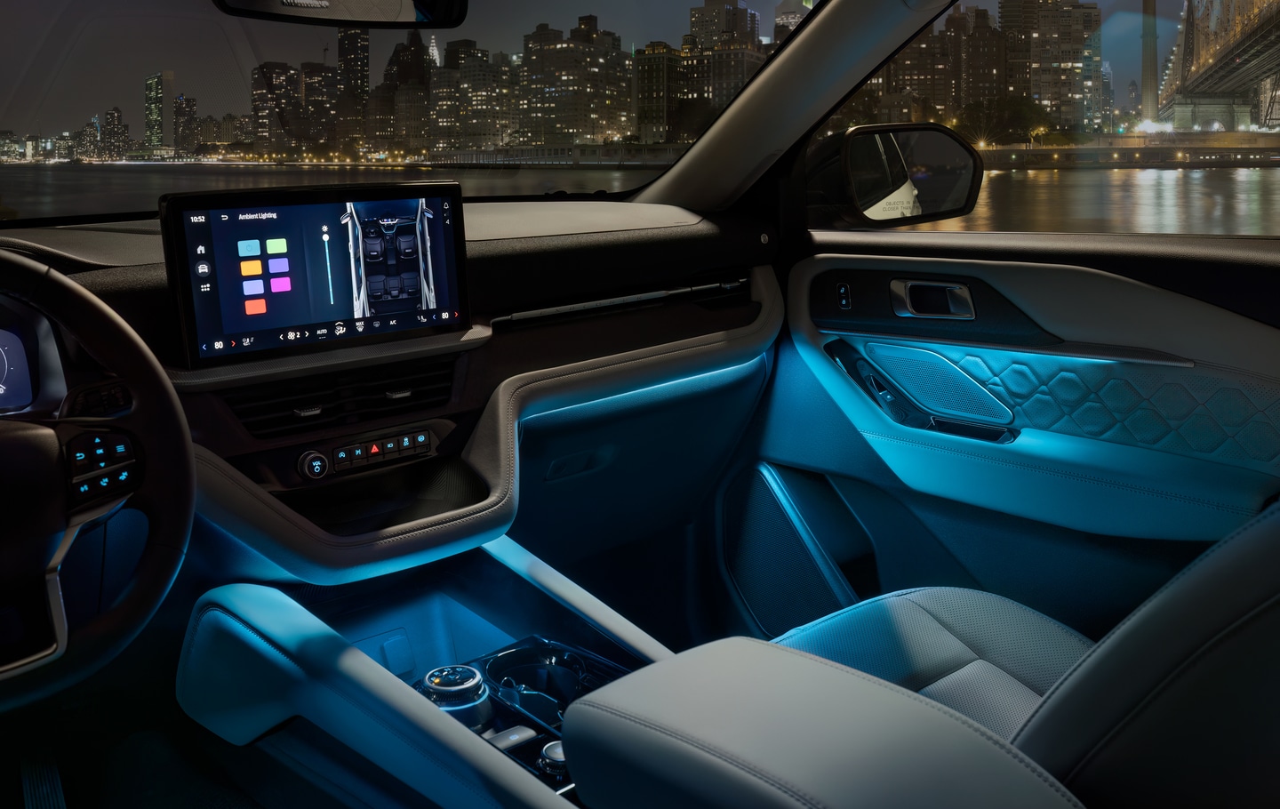 Wheel options range from 18-inch sparkle silver-painted aluminum on the Active trim to striking 21-inch magnetite-painted aluminum wheels on performance-oriented models. LED reflector headlamps with auto high-beam technology illuminate the road ahead, while available fog lamps enhance visibility during inclement weather. Body-colored bumpers and available panoramic fixed glass roofs with power shades add sophistication to the Explorer's exterior design.