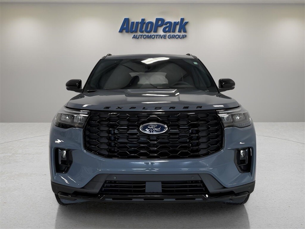 Vehicle Is Equipped With Equipment Group 300A Standard Package, Explorer ST-Line, 2.3L EcoBoost I-4, 10-Speed Automatic, 4WD, Vapor Blue, Onyx Cloth, 10 Speakers, 2nd Row Captain's Chairs w/E-Z Entry & Armrest, 3rd row seats: bench, 4-Wheel Disc Brakes, ABS brakes, Air Conditioning, Alloy wheels, AM/FM radio: SiriusXM with 360L, Apple CarPlay/Android Auto, Auto High-beam Headlights, Automatic temperature control, BlueCruise (Equipment + 1-Time Purchase), BlueCruise Hardware, Brake assist, Bumpers: body-color, Compass, Delay-off headlights, Driver door bin, Driver vanity mirror, Dual front impact airbags, Dual front side impact airbags, Electronic Stability Control, Emergency communication system: 911 Assist, Exterior Parking Camera Rear, Ford Connectivity Pack (1-Time Purchase - 7 Years), Four wheel independent suspension, Front & 2nd Rows Floor Liners w/Carpet Floor Mats, Front anti-roll bar, Front Bucket Seats, Front Center Armrest, Front dual zone A/C, Front fog lights, Front reading lights, Fully automatic headlights, Garage door transmitter, Heated door mirrors, Heated front seats, Heated steering wheel, Heated Unique Cloth Captain's Chairs, Illuminated entry, Knee airbag, Leather steering wheel, Low tire pressure warning, Navigation System, Occupant sensing airbag, Outside temperature display, Overhead airbag, Overhead console, Panic alarm, Passenger door bin, Passenger vanity mirror, Power door mirrors, Power driver seat, Power Liftgate, Power passenger seat, Power steering, Power windows, Radio: B&O Sound System by Bang & Olufsen, Rear air conditioning, Rear anti-roll bar, Rear reading lights, Rear window defroster, Rear window wiper, Remote keyless entry, SecuriCode Keyless Entry Keypad, Security system, SiriusXM w/360L (3-Year Plan), Speed control, Speed-sensing steering, Speed-Sensitive Wipers, Split folding rear seat, Spoiler, Steering wheel mounted audio controls, Tachometer, Telescoping steering wheel, Tilt steering wheel, Traction control, Trip computer, Variably intermittent wipers, and Wheels: 20" Ebony-Painted Machined Aluminum.